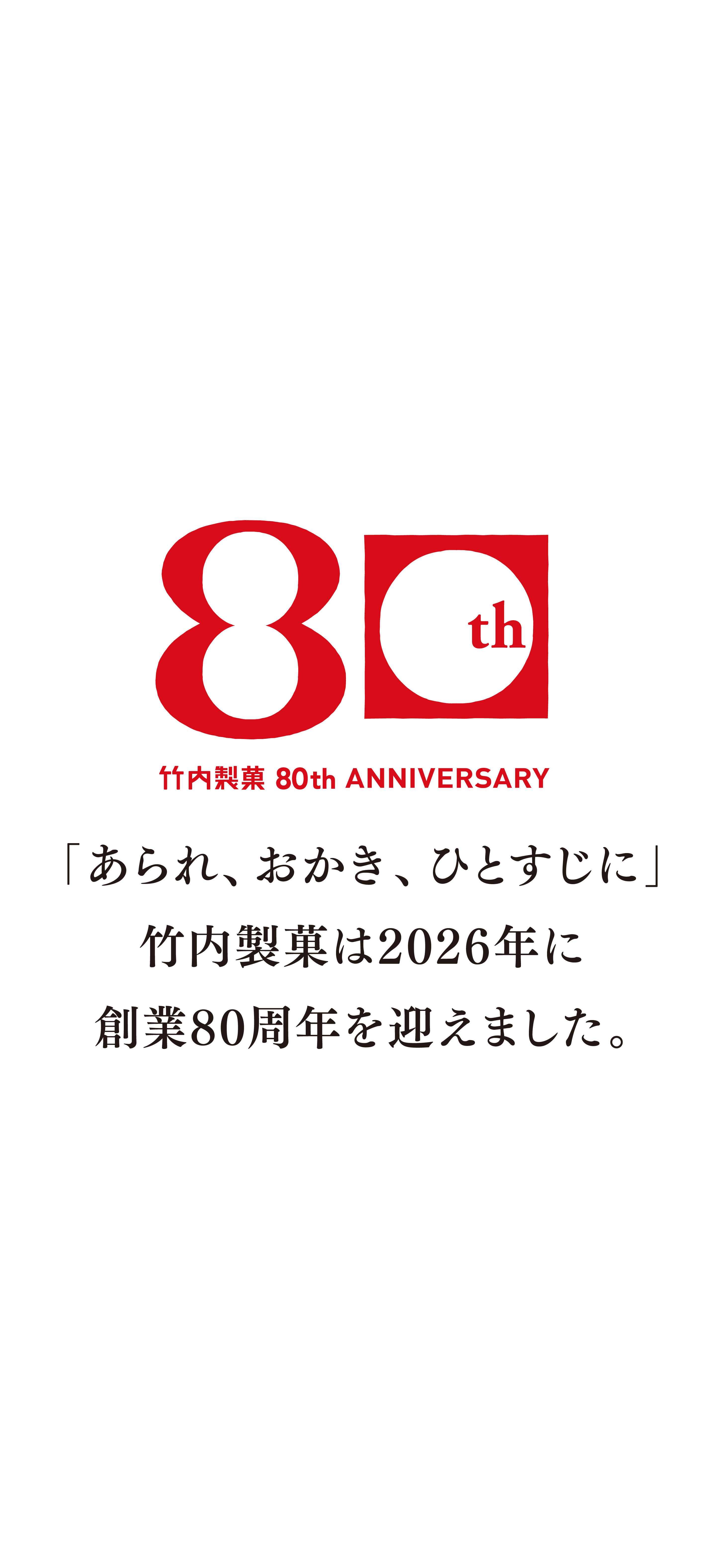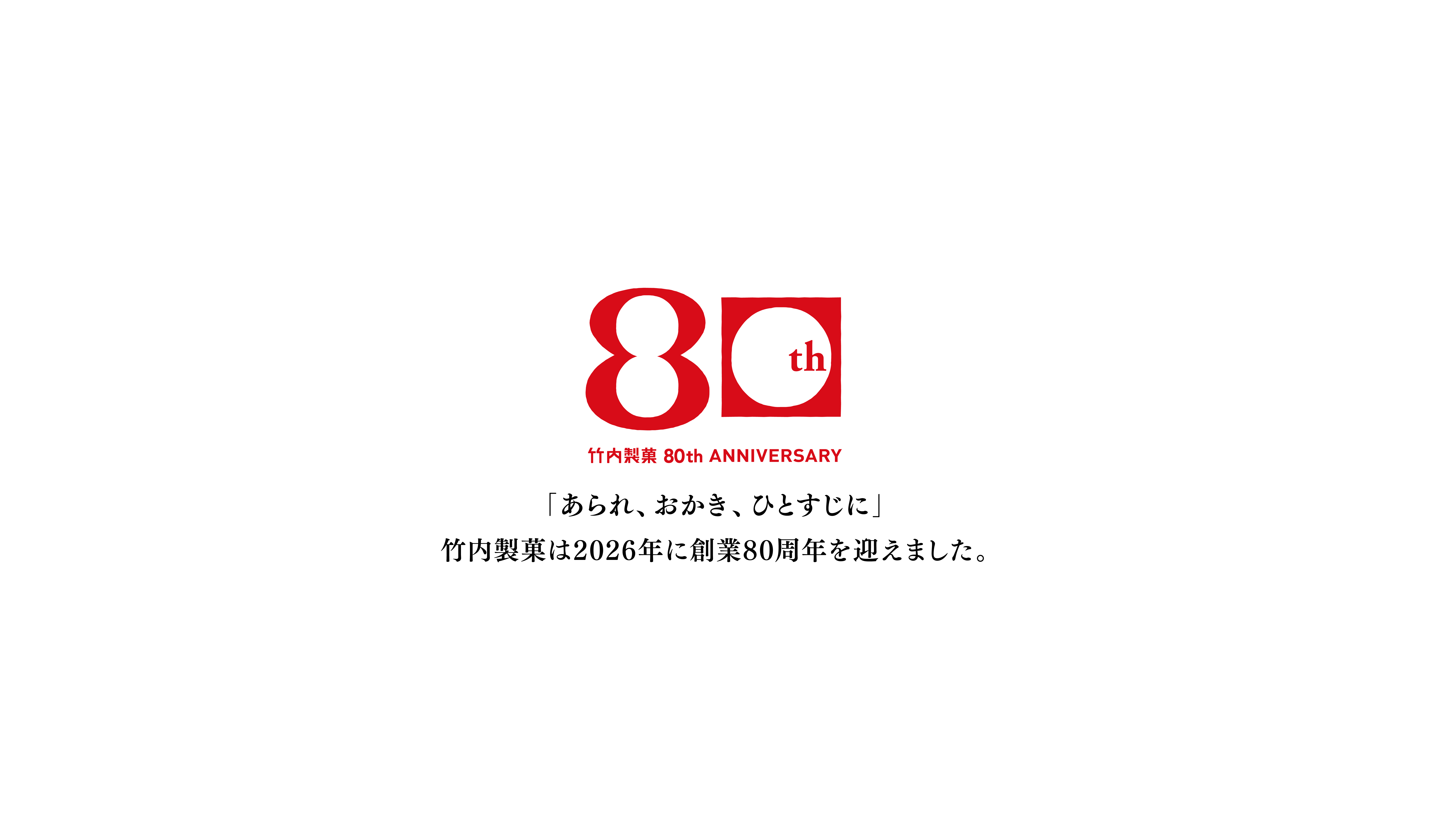わたしたち竹内製菓株式会社は、1946年の創業以来、皆様に支えられ、2026年をもって創業80周年という大きな節目を迎えることができました。この80年の歩みは、決して平坦な道のりではなく、常に皆様の支えとともに紡がれてきた歴史そのものです。長年にわたりご愛顧くださったすべての皆様へ、心より深く感謝申し上げます。